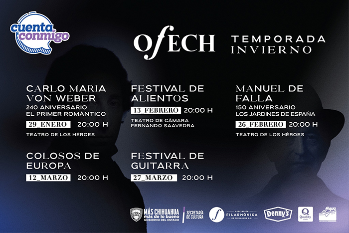 La Orquesta Filarmónica del Estado de Chihuahua (Ofech) anunció el inicio de su temporada de invierno 2026, que contempla presentaciones durante los meses de enero, febrero y marzo en distintos recintos de la ciudad de Chihuahua.