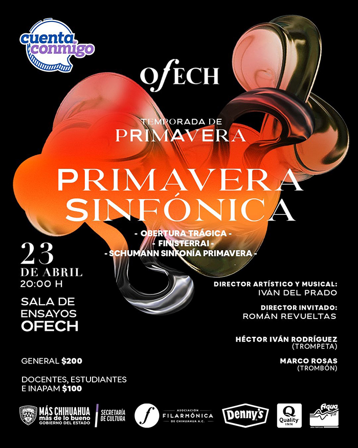 La Secretaría de Cultura invita a la ciudadanía a disfrutar del inicio de la nueva temporada de conciertos de la Orquesta Filarmónica del Estado con el concierto “Primavera Sinfónica”, con un repertorio lleno de intensidad y emoción, para el disfrute de las y los chihuahuenses.