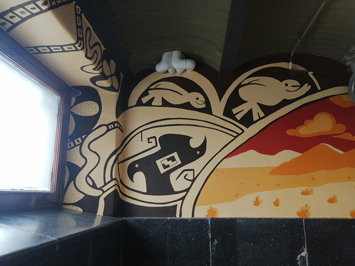 La paleta cromática del mural está inspirada directamente en los tonos utilizados en las vasijas policromadas de esta cultura, retomando su iconografía y adaptándola a un lenguaje plástico actual. De esta manera, la obra establece un diálogo entre pasado y presente, tradición y creación estudiantil.