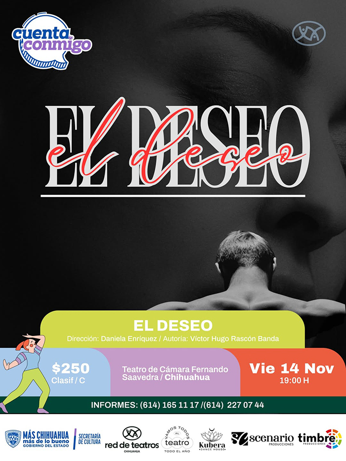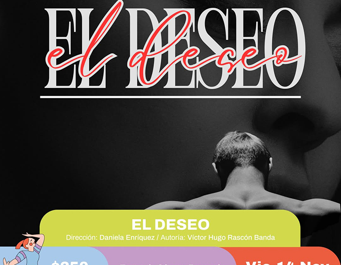 Este 14 de noviembre en el Teatro de Cámara Fernando Saavedra, Timbre Producciones ofrecerá la obra “El Deseo”, dirigida por Daniela Enríquez, a las 19:00 horas y dirigida a público adulto, con un costo de 250 pesos.