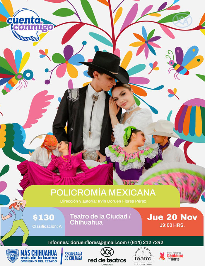 Ese mismo día, el Ballet Folklórico “Centauro del Norte” ofrecerá el espectáculo dancístico “Policromía Mexicana”, dirigido por Irvin Doruen, para todo público en el Teatro de la Ciudad, en Chihuahua, a las 19:00 horas con un costo de 130 pesos por boleto.