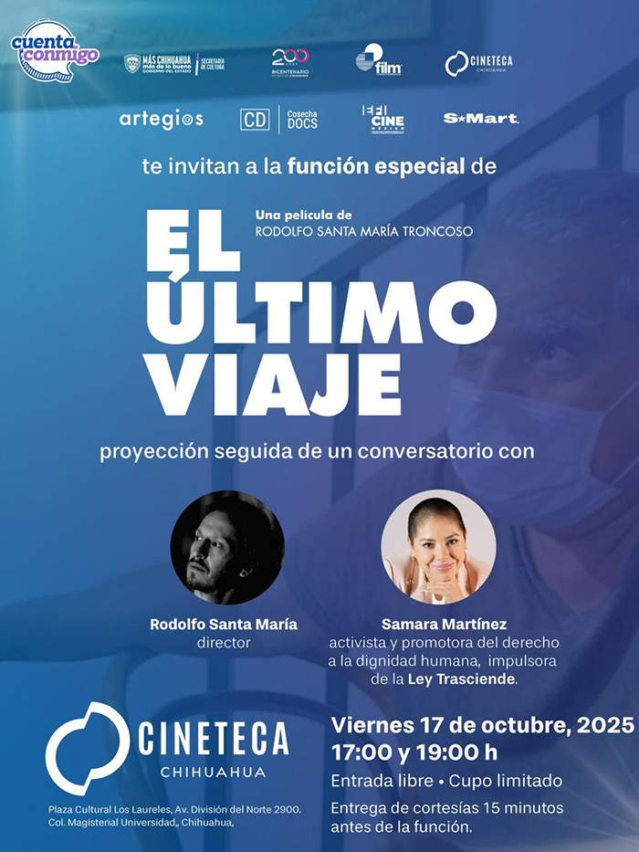 La Cineteca Chihuahua invita a las y los chihuahuenses a disfrutar de la proyección gratuita del filme “El Último Viaje”, del director Rodolfo Santa María Troncoso, a fin de fortalecer y enriquecer la oferta cultural local.