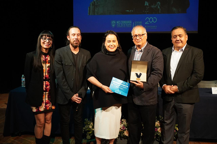 En ceremonia efectuada en el Teatro Experimental “Octavio Trías”, en el Centro Cultural Paso del Norte, el literato recibió la presea de manos de la secretaria de Cultura, Alejandra Enríquez Gutiérrez.