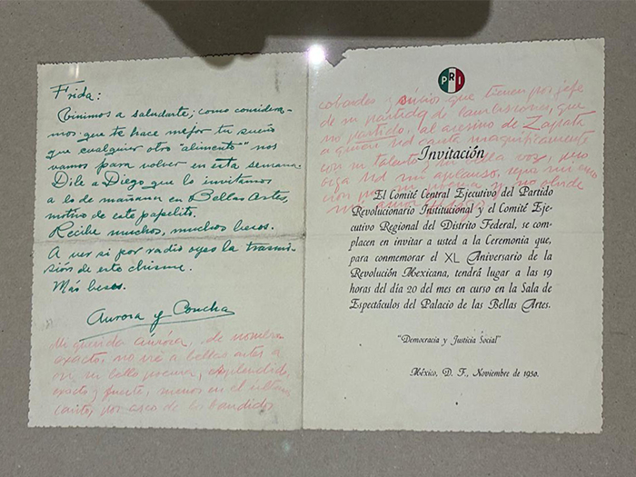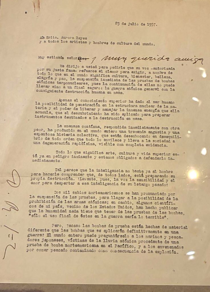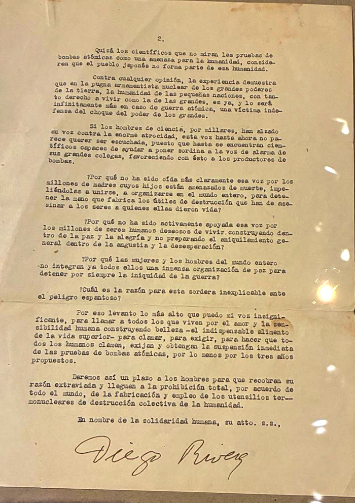 En la exposición hay un documento muy interesante dirigida a la artista Aurora firmado por Diego Rivera, que le sea autorizado un clamor mundial que existía en ese momento, de las suspensión inmediata de las pruebas de las bombas atómicas.