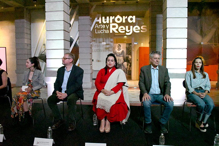 En el presídium estuvieron: Alejandra Ordoñez Castellanos, directora de Casa Chihuahua; Luisa Lara de Muralistas Auroras del Norte; Jorge Reynoso Pohlenz, director de Museo Nacional de San Carlos; Alejandra Enríquez Gutiérrez, Secretaria de Cultura; Héctor Godoy, nieto de Aurora Reyes; Velia Rojas Zambrano, Presidenta Promotora de la Cultura Mexicana A.C. y Melda Dayanira Chávez, directora Museal del Instituto de Cultura del Municipio de Chihuahua.