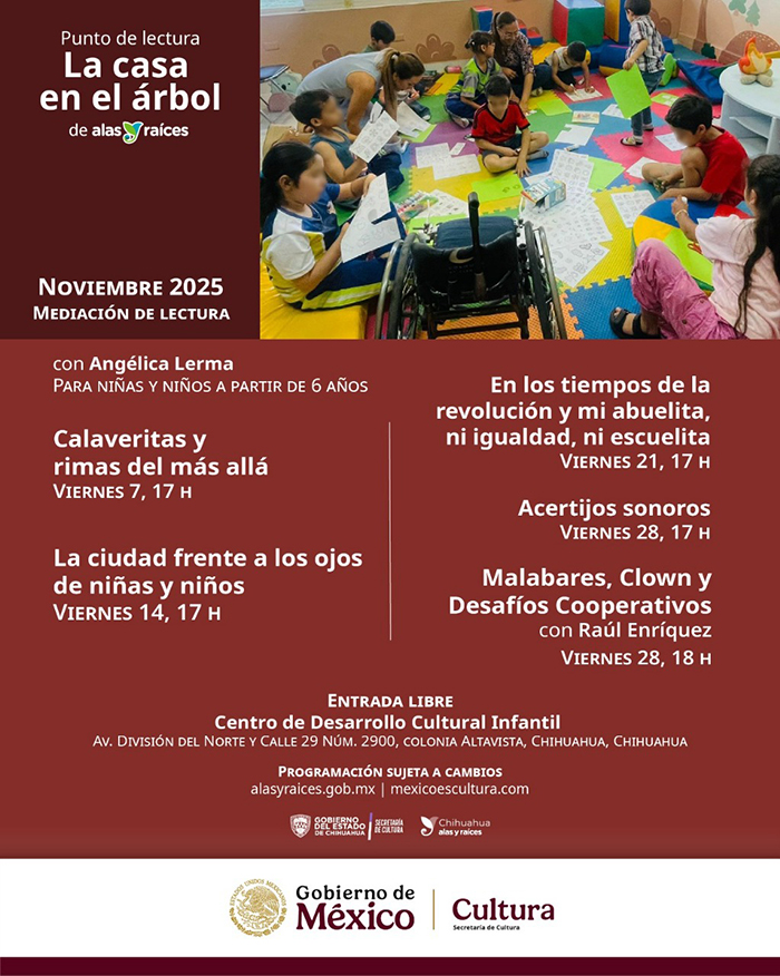 Para más información sobre las actividades dirigidas a bebés, niñas, niños y adolescentes del programa “Alas y Raíces”, se invita a consultar sus redes sociales y las de la Secretaría de Cultura, o bien, en www.culturachihuahua.com.