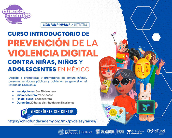 La Secretaría de Cultura, a través del programa “Alas y Raíces” convoca a promotores de cultura infantil, funcionarios y población en general, a inscribirse al curso virtual sobre prevención de violencia digital contra niñas, niños y adolescentes.