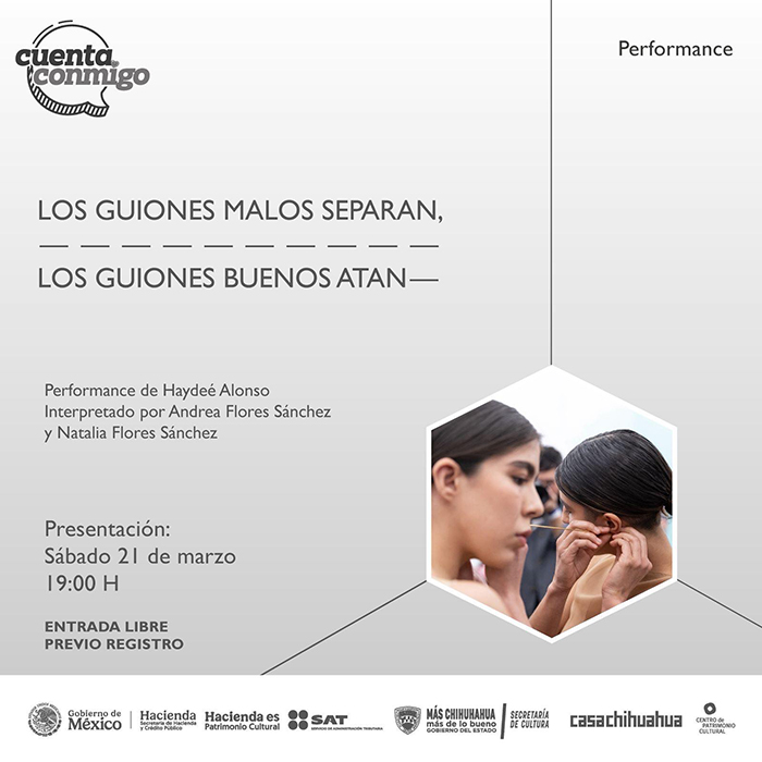 La Secretaría de Cultura, a través del Centro de Patrimonio Cultural Casa Chihuahua, invita a la ciudadanía a disfrutar de la presentación del performance “Los guiones malos separan, los guiones buenos atan”, en colaboración con la Secretaría de Hacienda y Crédito Público.