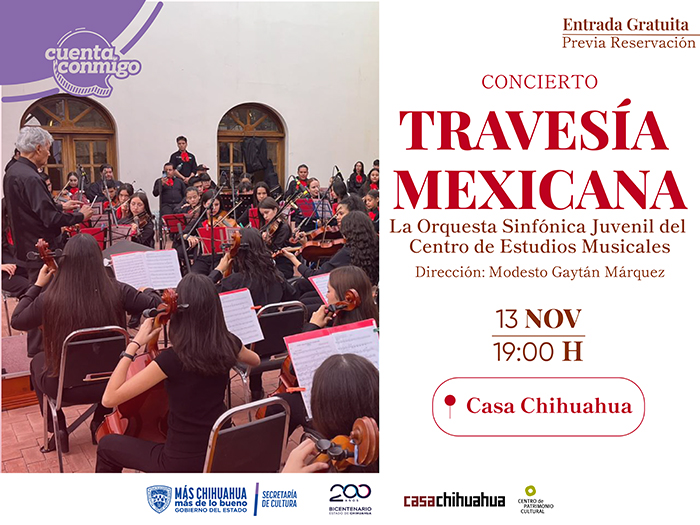 Casa Chihuahua invita al público chihuahuense a disfrutar de una velada con la Orquesta Sinfónica Juvenil del Centro de Estudios Musicales, en el marco de su programa cultural Jueves de Puertas Abiertas con el concierto “Travesía Mexicana”.