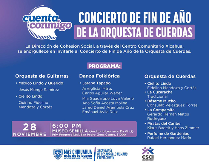 El Gobierno del Estado, a través de la Secretaría de Desarrollo Humano y Bien Común, invita al Concierto de Fin de Año de la Orquesta de Cuerdas del Centro Comunitario Xicahua, en el que alumnas y alumnos compartirán su talento en una tarde de música y alegría.