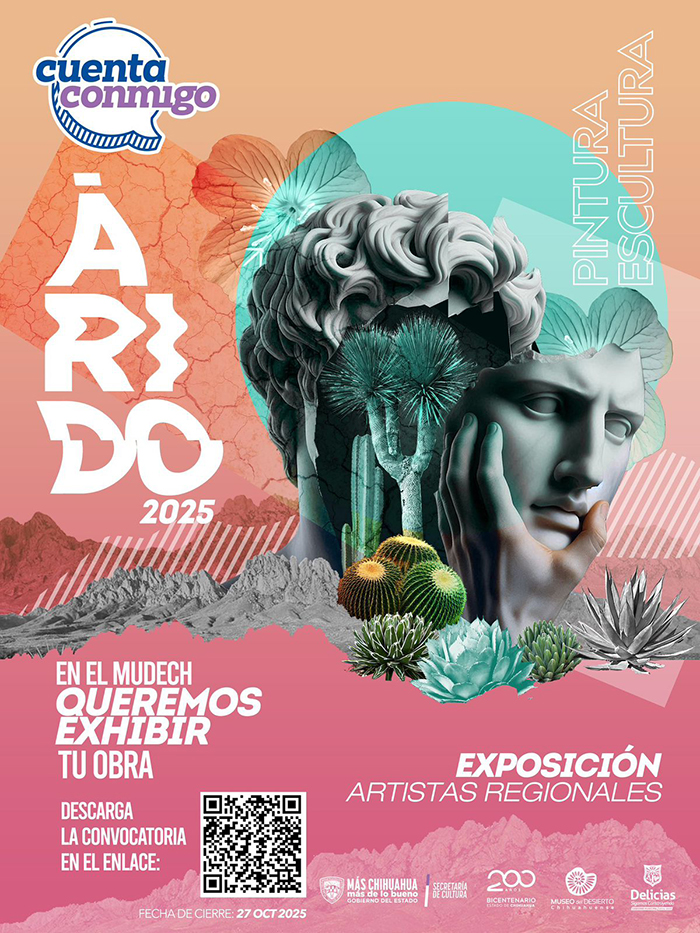 La Secretaría de Cultura, a través del Museo del Desierto Chihuahuenses (Mudech), en colaboración con el Ayuntamiento de Delicias, invita a artistas residentes de los municipios de Delicias, Meoqui, Rosales, Saucillo, Julimes, La Cruz, San Francisco de Conchos y Camargo, a participar en la segunda edición de la exposición colectiva “Árido”.