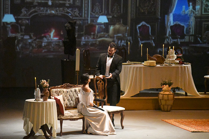 La puesta en escena, una ópera en tres actos basada en la novela La dama de las camelias de Alejandro Dumas , El salón en casa de Violetta , Escena 1: en la casa de campo de Violetta en las afueras de París y Escena 2: fiesta en casa de Flora, donde fusionaron la música, teatro, poesía y artes visuales.