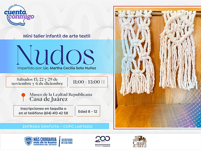 La Secretaría de Cultura, a través del Museo de la Lealtad Republicana Casa de Juárez, invita a madres, padres de familia y tutores a inscribir a niñas y niños de la ciudad de Chihuahua en el Mini Taller Infantil de Arte Textil “Nudos”, que se llevará a cabo en las instalaciones del museo.