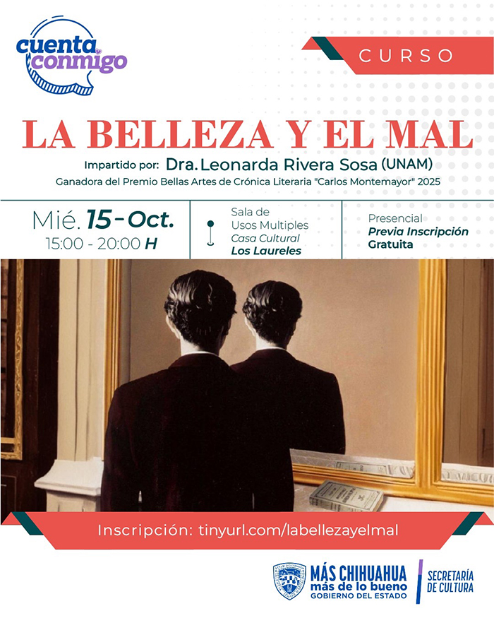 La Secretaría de Cultura invita al público en general, a tomar el curso “La Belleza y el Mal” impartido por la ganadora del Premio Bellas Artes de Crónica Literaria “Carlos Montemayor” 2025, Leonarda Rivera Sosa.