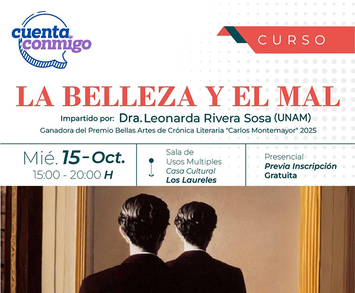 La Secretaría de Cultura invita al público en general, a tomar el curso “La Belleza y el Mal” impartido por la ganadora del Premio Bellas Artes de Crónica Literaria “Carlos Montemayor” 2025, Leonarda Rivera Sosa.