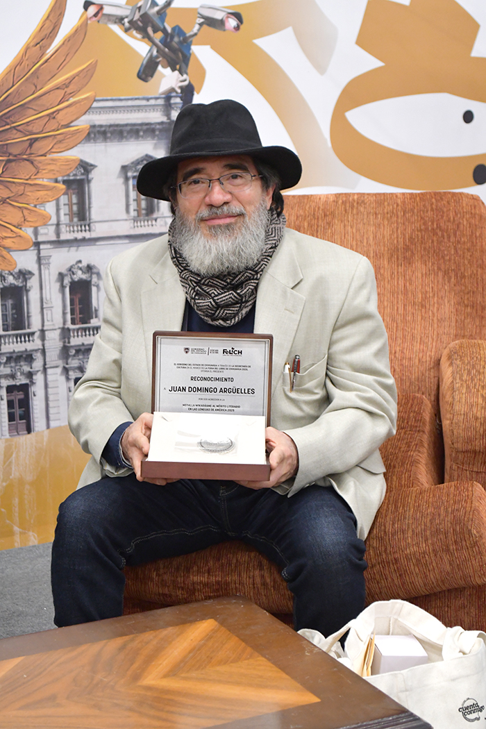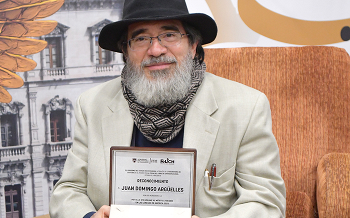 El Gobierno del Estado, a través de la Secretaría de Cultura, entregó al poeta quintanarroense Juan Domingo Argüelles, la Medalla Wikáarame como reconocimiento al mérito poético, en el marco de las actividades de la Feria del Libro Chihuahua (Felich) 2025.
