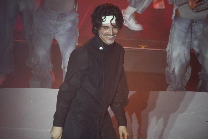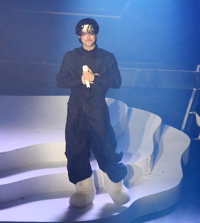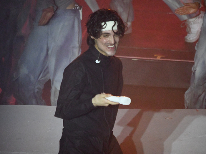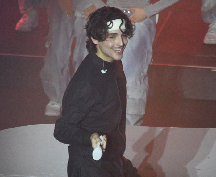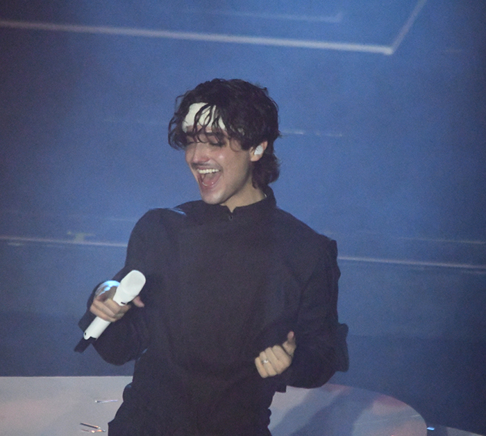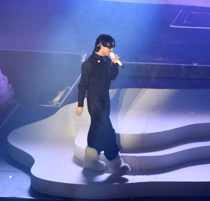 El concierto comenzó con los primeros acordes que resonaron detrás de un imponente telón blanco. Con un despliegue visual de primer nivel, la cortina se abrió lentamente para revelar al artista emergiendo desde un elevador en el centro del escenario, rodeado de sus talentosos bailarines y músicos.