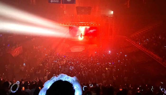 La audiencia, integrada mayoritariamente por jóvenes que han seguido su ascenso en redes sociales, creó una atmósfera mística: cientos de coronas blancas iluminadas y alas de luces LED brillaban entre la multitud, mimetizándose con la estética del show. Durante el concierto, Humbe deleitó a sus fans con una selección de sus éxitos más emblemáticos, incluyendo “El Poeta”, “Te conocí en Japón” y “Amor de Cine”, temas que fueron coreados de principio a fin.